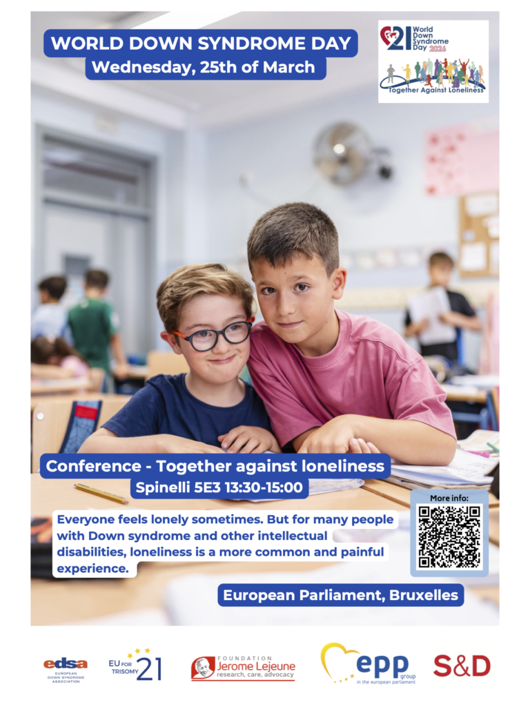 On Wednesday, 25 March 2026, EDSA and EU for Trisomy 21 will co-host the World Down Syndrome Day 2026 celebration at the European Parliament under the title Together Against Loneliness. The event will focus on the 2026 World Down Syndrome Day theme of loneliness and belonging, bringing much-needed attention to an issue that deeply affects people with Down syndrome and their families.
